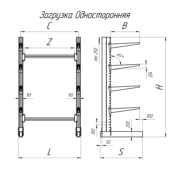 Стеллаж консольный металлический (C*S*H) 1750*1300*1500 мм имеет 1 ярус с нагрузкой до 1500 кг на 2 консоли.